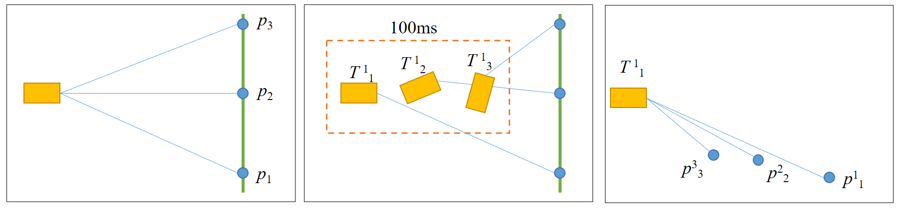 Finally, transforming each LiDAR point yields the corrected (undistorted) points at timestamp :