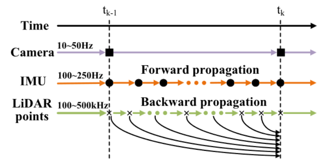 - Example: A 10 Hz LiDAR (e.g., Livox Avia) generates 24,000 points per frame (100 ms), and a 200 Hz IMU generates 20 measurements in that same interval. Thus, multiple LiDAR points exist between any two IMU samples.